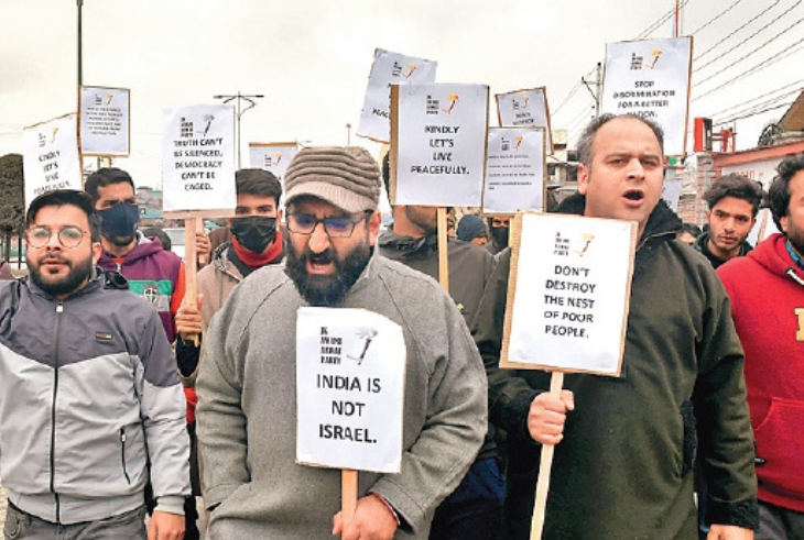 पुलिस ने शोरूम के मालिक सहित पांच को गिरफ्तार किया है। जम्मू के मइसम्मा, सुंजवां, बठिंडी और नरवाल बाईपास इलाकों में हजारों लोग सड़कों पर उतरे। वे अपने हाथों में तिरंगा झंडा लिए हुए थे। आतंकी संगठन टीआरएफ ने कार्रवाई कर रहे राजस्व अधिकारियों को अंजाम भुगतने की धमकी दी है। पीडीपी नेता महबूबा मुफ्ती ने कहा कि भाजपा ने जम्मू-कश्मीर को अफगानिस्तान बना दिया है।