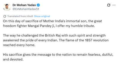 On this sacred day, CM Dr. Yadav urged everyone to embrace the values of freedom fighters, fulfill their duties, and participate actively in nation-building. The courage and dedication of Mangal Pandey will forever remain a guiding light and source of inspiration for all Indians.