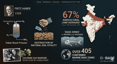 • Fritz Haber was also the one who developed chlorine gas warfare during WWI — the same man, the same science.Sources: ICAR Soil Health Report 2022, Science Journal Vol. 321, BASF Corporate History