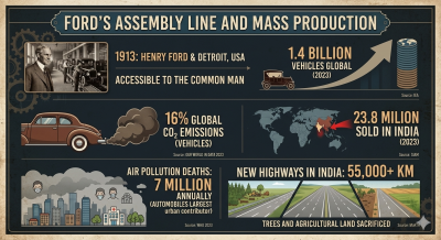 When: 1913 (Model T, Ford Assembly Line)Who: Henry Ford, Detroit, USAWhat Happened: For the first time, automobiles became accessible to the common man.Impact on Nature and Humanity: