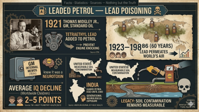 In India, leaded petrol remained in use until 2000 — resulting in neurological exposure for an entire generation.Sources: The Lancet Planetary Health 2023, American Journal of Public Health, EPA Historical Records