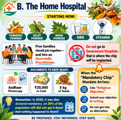 Five families should join together—and hire an Ayurvedic practitioner. Do not go to government hospitals; that is where the chip will be implanted.